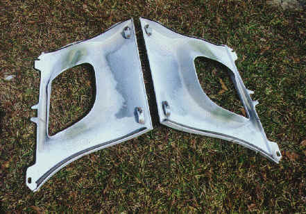 Next, I made a simple aluminum sheet "mold" for the holes in the front sides of the ducts. I covered the rear hole with a piece of duct tape on the outside of the panel. I then laid up several layers of fiberglass mat over the front and rear holes on both panels. After drying, I removed the molds and ground the fiberglass patches in the ducts smooth. Then I applied a small amount of body filler and block sanded extensively to fill in the lines and level out the low spots.