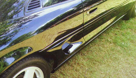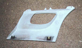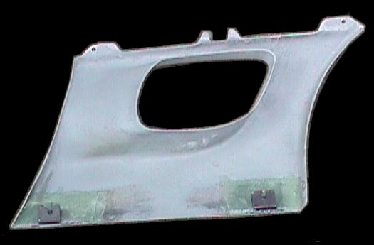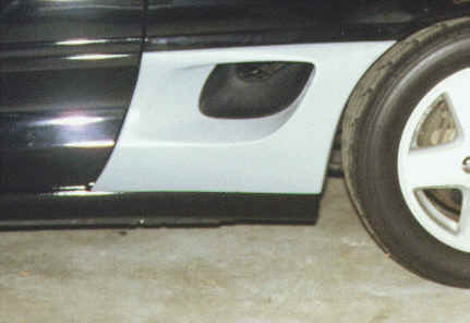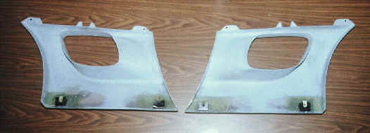 The panels came with no lower mounting provisions at all, so I fabricated some steel mounting brackets that use the stock mounting hardware and locations along the bottom of the panel. I used this technique to get the brackets installed in the correct positions: first, I installed the brackets in their normal positions on the car. Then, I placed a thin layer of epoxy cement on both the fiberglass panels and the mating surface of the brackets. Next, I installed the side intake panels in position, allowing the panels to contact the brackets. I used some blocks to hold the panels against the brackets and allowed them to dry overnight.