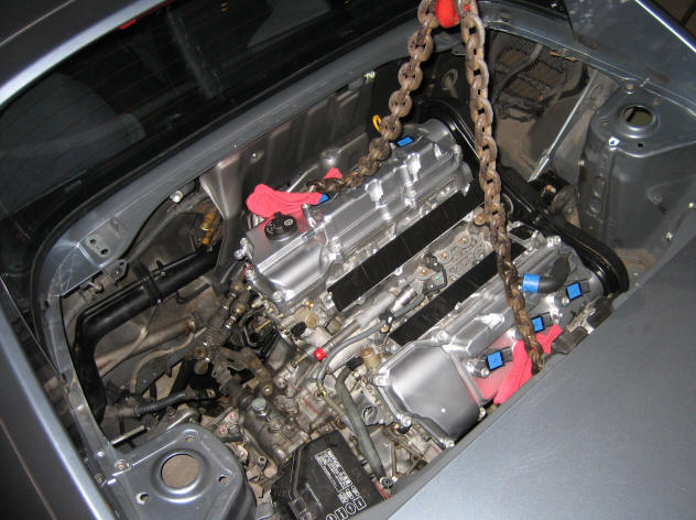 Engine sitting under the car after lowering the car back down to a workable