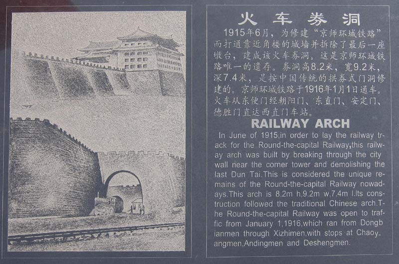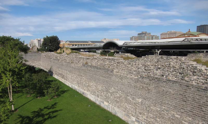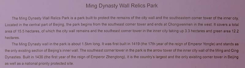 The Ming Dynasty Wall Relics Park is located immediately south of the main Beijing rail station. The park encompasses a wall of about 1.5 kilometers in length running from west to east from 39°53'59.60"N 116°24'52.90"E to the corner tower at 39°54'0"N 116°25'45"E. The park was begun in June of 2001 and the wall was repaired beginning in Spring of 2002.