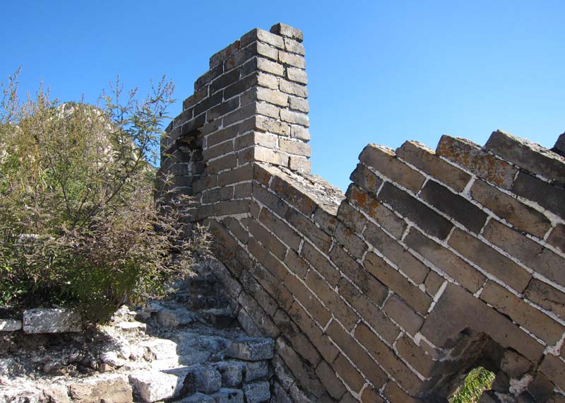 Bricks on inclined parapets normally run either horizontally or parallel to the incline. From time to time, it was necessary for builders of the Great Wall to transition from one style to the other. The way these transitions were designed varies from place to place. Here are a few examples.