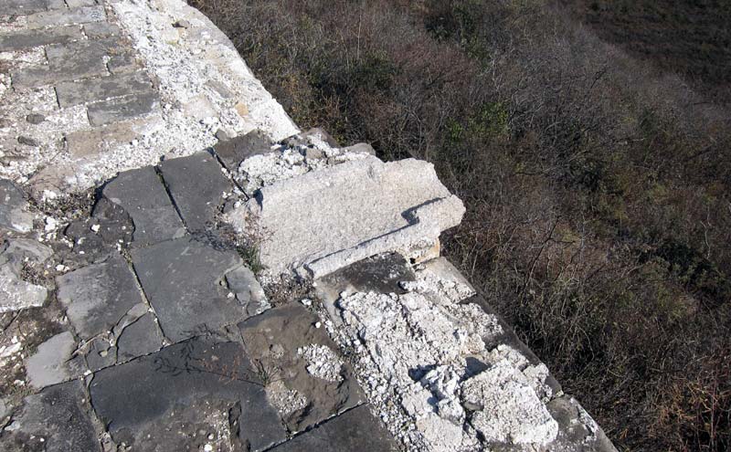In looking at the Great Wall from the outside, one would assume that, like bricks, the cut stone foundation blocks are rectangular cuboid in shape, that is, all of the angles are approximately 90-degree or right angles. It’s only when you get the opportunity to see the insides of these stones that you learn that this isn’t so. Often the inner parts of these stones are cut in such a way as to reduce weight and material usage. The inner faces of the ends often taper inward at angles of greater than 90 degrees.