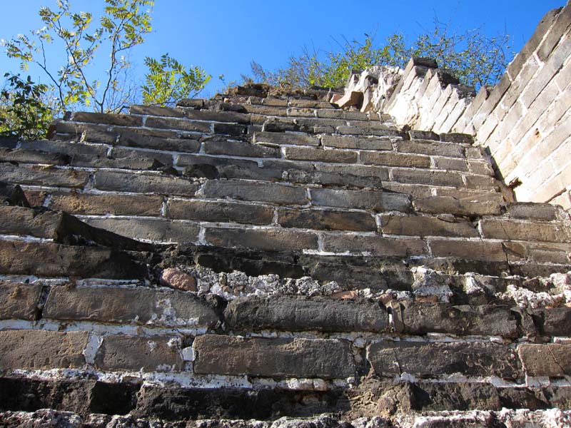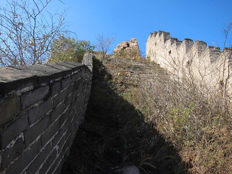A view from where the wall starts to climb steeply - at the top is the beginning of the remaining bricks