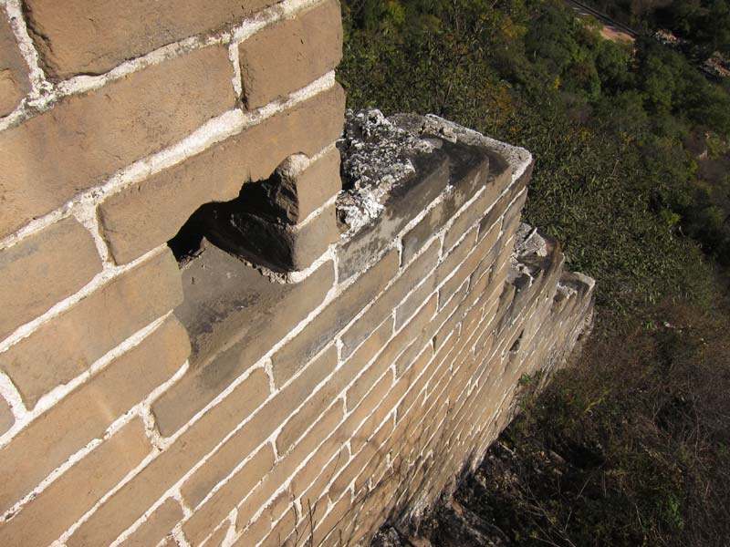 Shangguan consists of a main wall that is roughly perpendicular to the Badaling Expressway, and a tail wall that is roughly parallel to the Badaling Expressway and heads south from about halfway up the main wall. The main wall is brick for its first half, and then it turns to stone. The wall ends before the top of the mountain, but there is a stone watchtower at the top of the mountain. I guess this wall was built in the early Ming Dynasty, and then parts of it were reinforced with brick later in the Ming Dynasty.