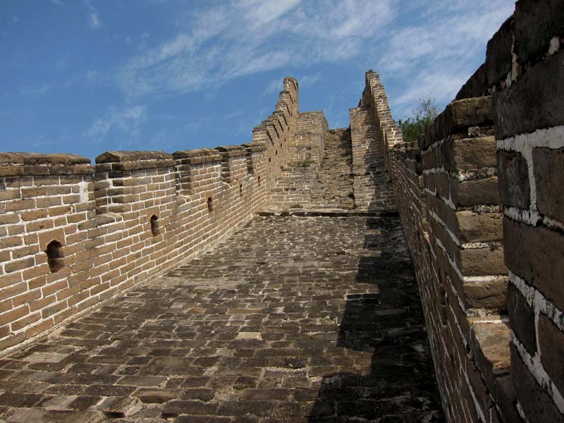 On the west side, the initial slope alternates between steps and ramp. The ramped areas especially can be very slippery when wet. A tablet in the side wall at the west side exit of tower 2 records information about personnel in charge and other details about building the wall in that area. Tower 3 at the summit has collapsed, and no attempt to rebuild it was made when the wall was repaired in 2005. In fact, the surface of the wall at a small area around the summit was made from uncut stones for some reason. After one more tower, which is in very good condition, the wall goes steeply down towards Zhuangdaokou. The wall is surfaced in bricks until the last tower before the bottom. Beyond this tower, steps have been made from large uncut stones, again far different from the original construction. Having been here before and after the wall was rebuilt in 2005, I was appalled at the way the reconstruction was done and several times I found myself lamenting the changes and wishing it had been left in its original state.