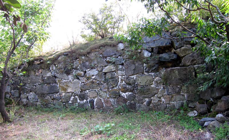 Tower 8 marks the top of the hairpin. At this point, the wall turns to the right and soon begins a steep downhill plunge. At the center of this downhill slope is an abrupt drop of several meters which can be climbed or can be circumvented via trails on the left (east) side of the wall.