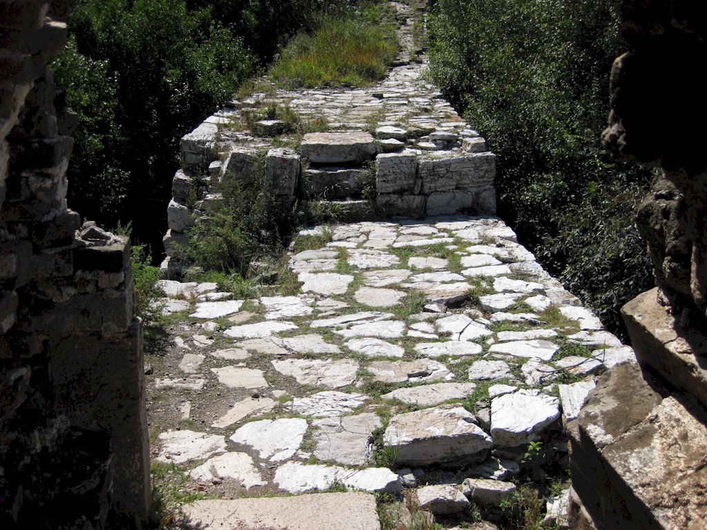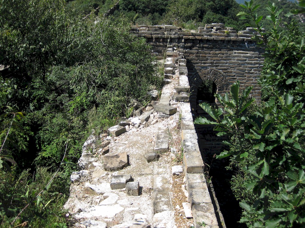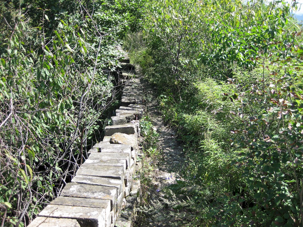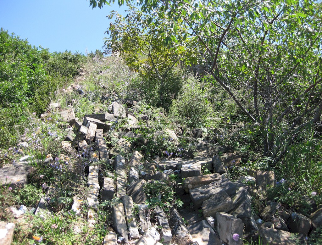 The two sides of the hairpin are different from each other. The eastern side is covered with smooth stones that can be slippery, especially if not totally dry. The western side is covered in loose bricks and stones. About halfway up the eastern side, there is a tower that is partially collapsed. From below (south), the wall enters this tower from the bottom, as usual. But from above (north), the wall enters the tower from its top. Therefore, to pass through this tower you must climb up or down through a hole in the ceiling of the inside of the tower.