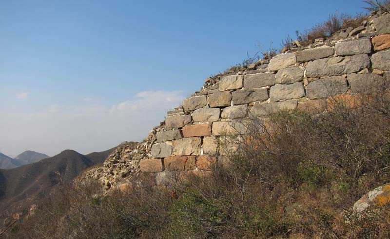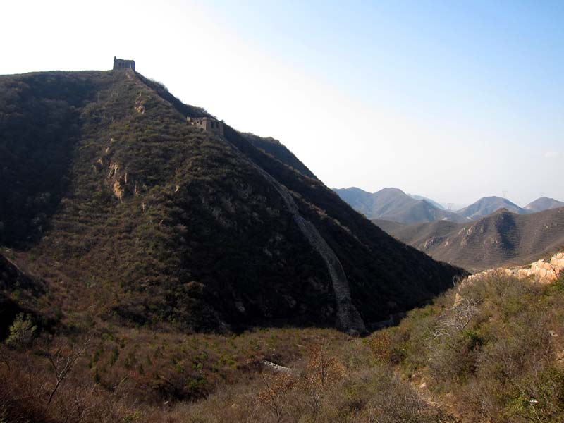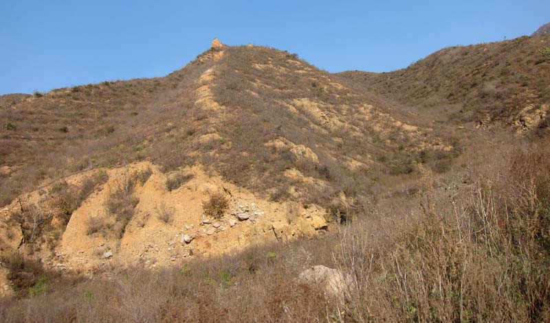 On the west side of the valley, towards Shixiaguan, the initial part of the wall is very risky to try to climb. You will find a trail on the south side of the wall that bypasses the first span and joins the wall at the first tower. Further up, at the second tower, is an older Ming wall heading towards the west and northwest. It just forms a loop before it ends half way up a mountain that becomes very steep. This wall is in even more deteriorated condition than the one that leads north towards Badalingzhen. The main wall turns left at the second tower and leads towards the south.