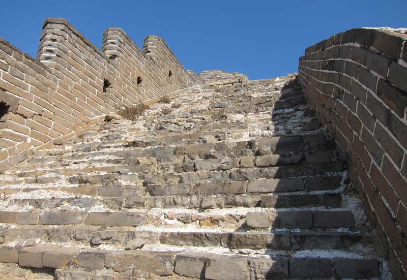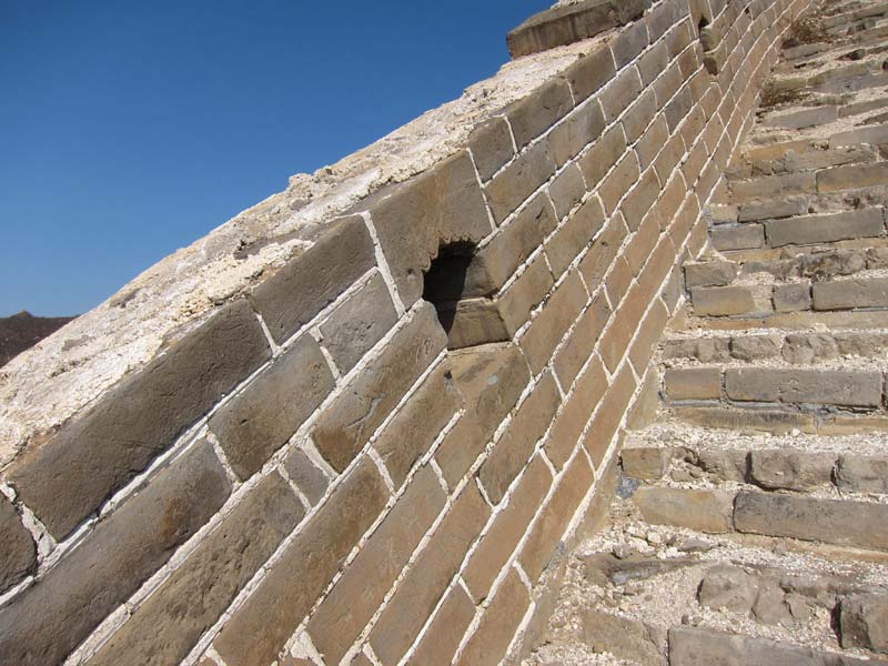 On the east side of the valley, the wall climbs in a continuous incline for 1200 meters (4000 feet). Most of this incline has a very difficult climbing surface due to the presence of thousands of loose and broken bricks on the surface of the wall, making each and every step count.