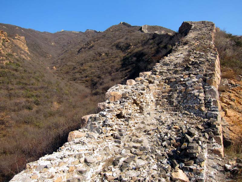 Once you've passed the top of the mountain, you will find a fork in the wall. To the left is an older wall that runs north towards Badalingzhen. To the right is the main wall running northeast towards Badaling which soon arrives at the Ancient Badaling Great Wall.