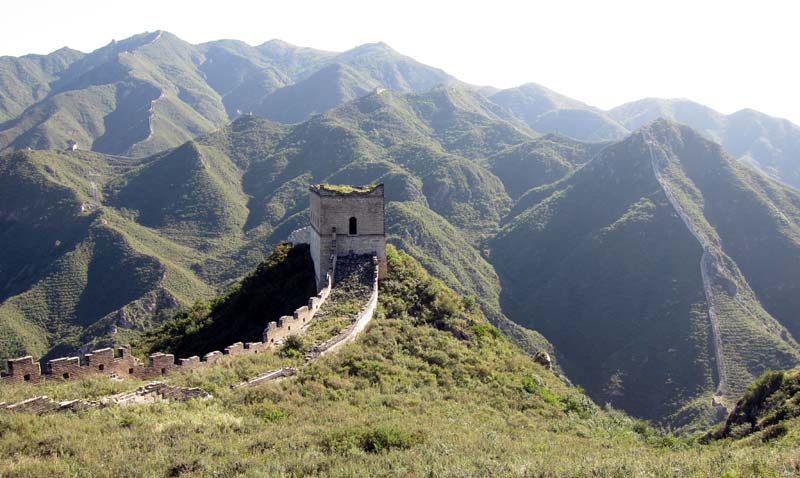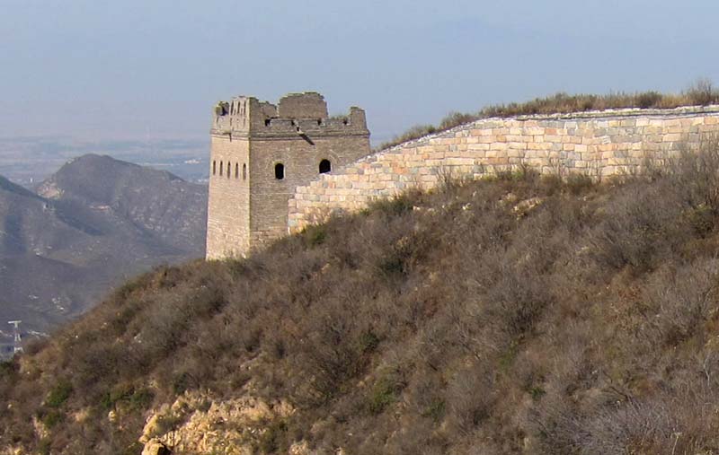 Once you join the wall, you can walk to your left (east) to the end tower. This tower is called Kouzilou. It's a pretty high step to get from the wall up into the tower, but it can be done. Looking out the door on the east side of the tower, you will see a magnificent view of the valley and the wall on its other side. You will also see that there is a further, short segment of the wall leading to a dead end to the east. I was tempted to climb out of the tower and down to this segment, but realized that I may have difficulty getting back up into the tower, or otherwise getting off of this precariously situated piece of Great Wall, so I decided not to try it.