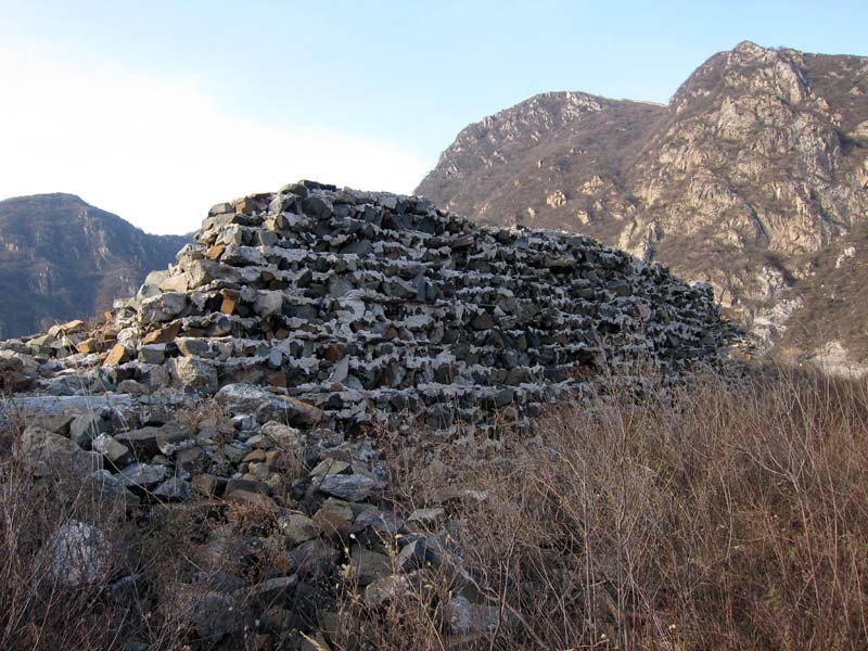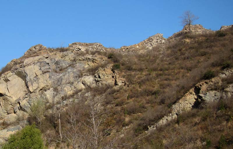 If you walk along the road to the south of the wall for about 820 meters (2700 feet), you will see a small area on the left that serves as a bus stop. On your right will be the village of Shixiacun. At the back of this area is a trail that leads up a long incline and meets the Great Wall at the top of its first slope. This will allow you to skip the entire long and dangerous first incline of the east side of Shixiaguan. This path is about 700 meters (2320 feet) in length and in some places it is steep.