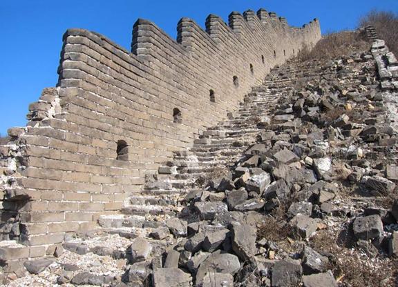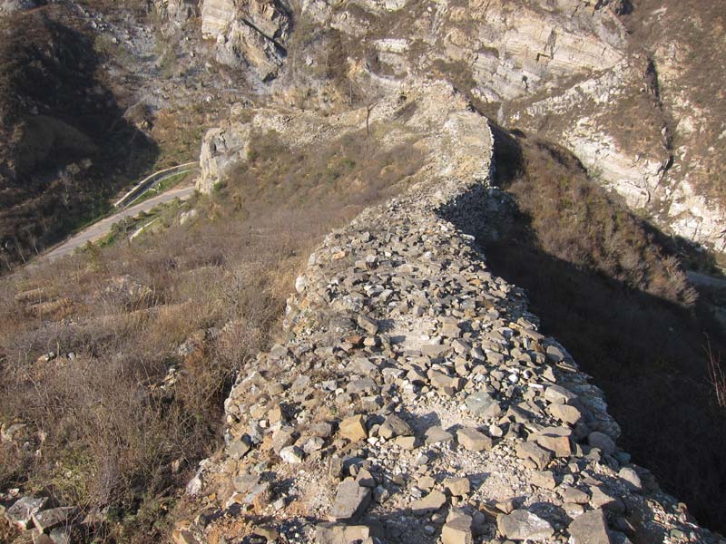 Turning around and heading the other way, you will find the wall not excessively steep but challenging nonetheless due again to the many loose bricks and stones. When you are near what seems to be the high point before the wall's descent into the next valley and the Chenjiabao area, you will reach a spot where there is a very steep downhill climb of about fifty steps and well over a 45-degree angle. Fortunately, these steps are in decent condition and there is a parapet to hold onto for most of the way while you carefully make your way down. Unfortunately, it ends before you reach the bottom, and here you must be even more careful.