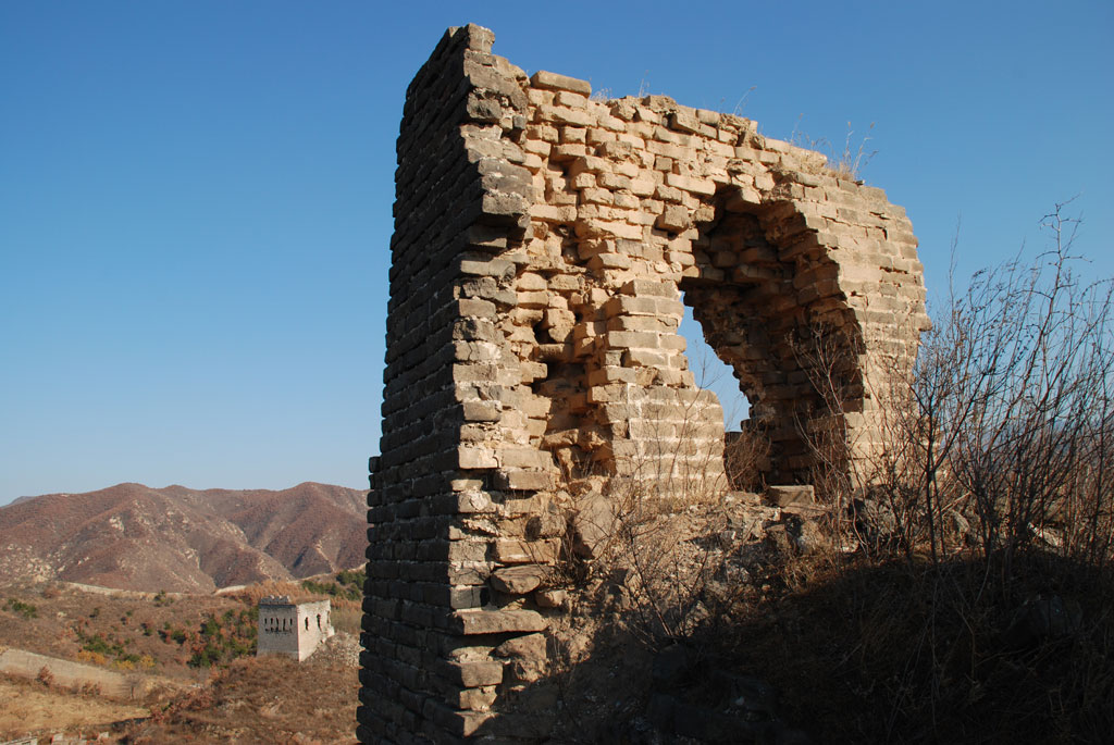 On each side of the pass, as the Great Wall comes down from the high mountains, the wall splits into two parallel walls. This left a triangular area on each side of the pass which served as a fortress and is known as a crescent wall. In between the two crescent walls was a walled pass town with several watch towers. The relics of these fortifications can be seen today.