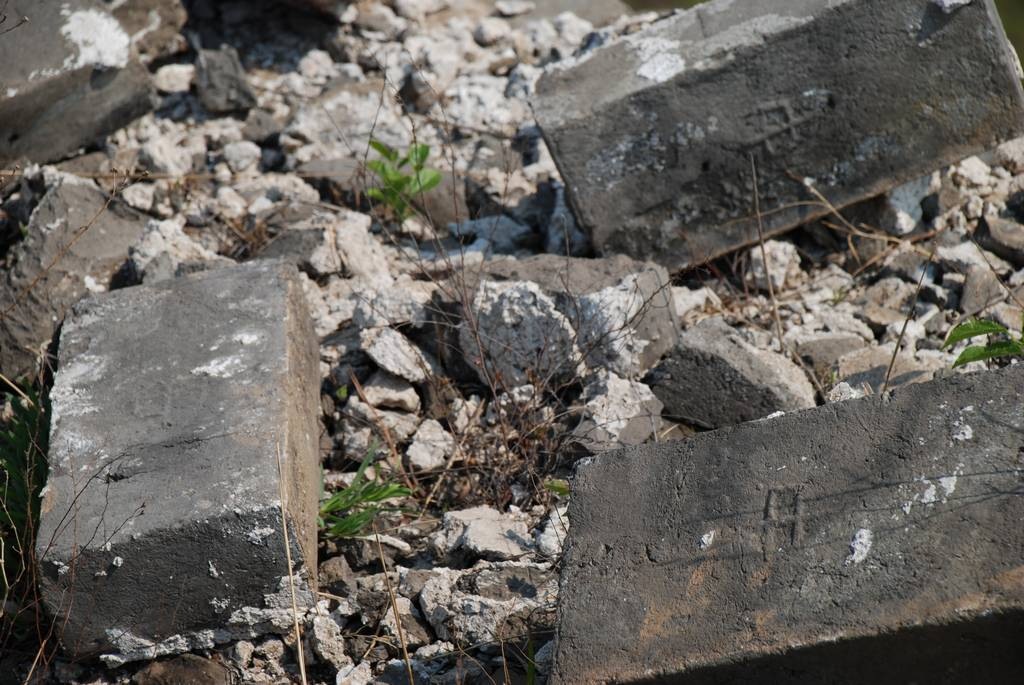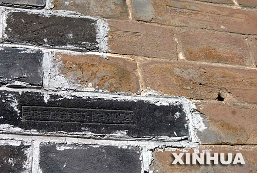 Ancient and modern inscribed bricks coexisted in restored wall at Dongluochengguan in Hebei east.