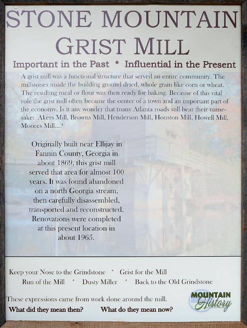 In 1965, this hundred-year-old grist mill was moved to Stone Mountain from its original site near Ellijay, Georgia, where it was built in 1869. The grist mill is located on the east side of the mountain at 33°48'22.50"N 84°8'5.50"W.
