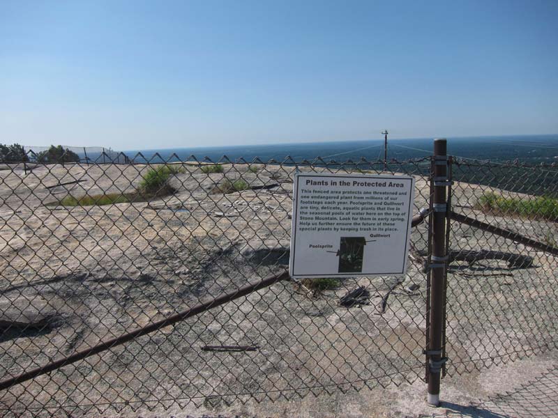 At the top of the last steep section, the mountain becomes nearly level. On your right there is a fence that protects a large area near the summit. Some of the very rare plants that can be found on Stone Mountain are protected by this fence. A sign illustrates poolsprite and quillwort.